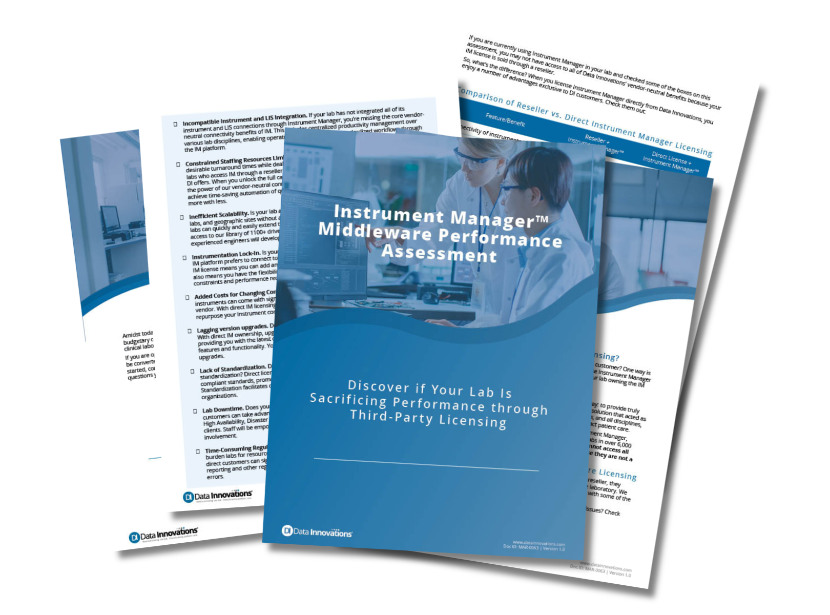 Find out what areas of performance your lab may be falling short in as a third-party licensed user of Instrument Manager. Download our Instrument Manager Middleware Performance Assessment and complete the checklist to rate your lab.